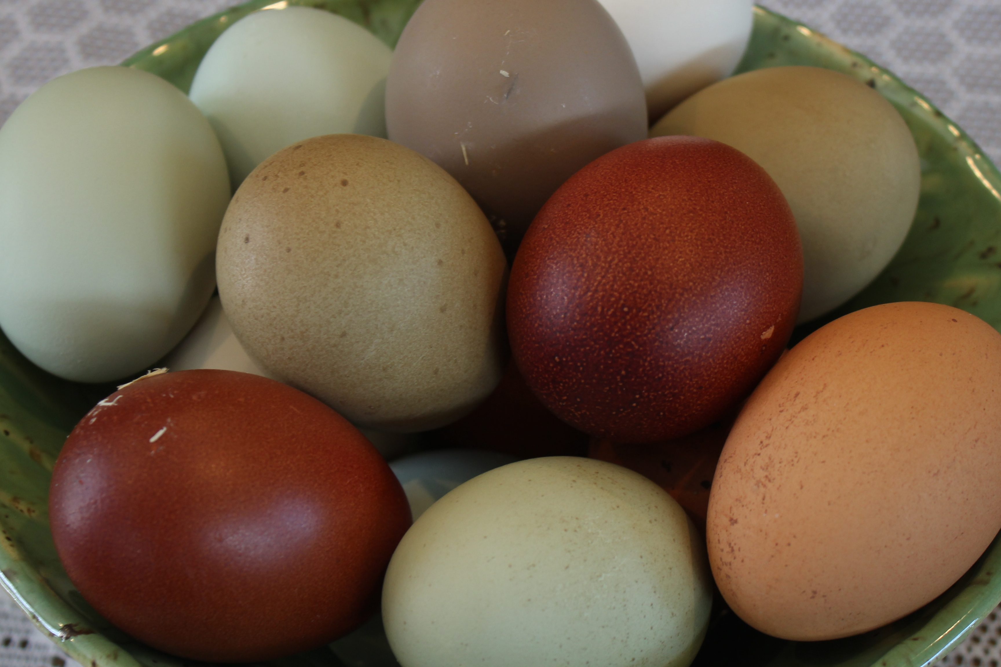 Since these birds are a project mix, there is a lot of variation from bird to bird. Some of our hens lay heavily speckled eggs, while some lay closer to a sage green color, and we even have a hen who lays a beautiful gray colored egg!